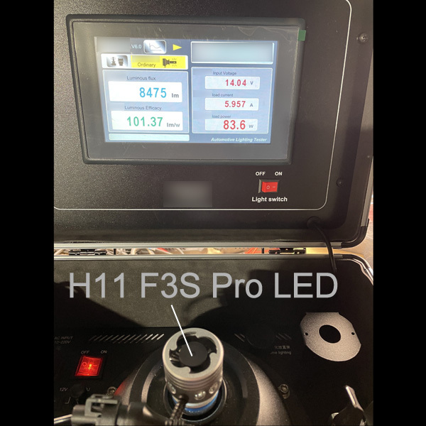 The F3S Pro consistenly tested at 8400lm per bulb, 83.6W, and 14.04Amps on start-up. As the F3S Pro bulb temperature increased the lumen output decreased and stabilized at 6878lm (after approximately 5 minute run time), still making it brighter than the GTR Ultra 3, which also likely shows a runtime lumen output decrease over time, but it's not being reported. See actual lumen test photo below.